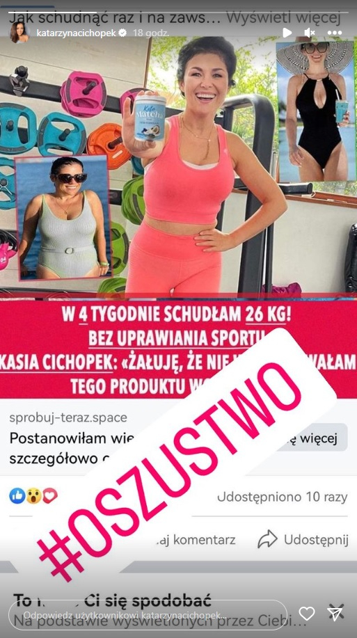 40-latka bezzwłocznie ostrzegła swoich fanów na Instagramie, aby Ci nie wierzyli w fałszywą reklamę sygnowaną jej nazwiskiem. Na Insta Stories opublikowała zrzut ekranu przestępczej treści oraz oznaczyła ją hasztagiem „oszustwo”.