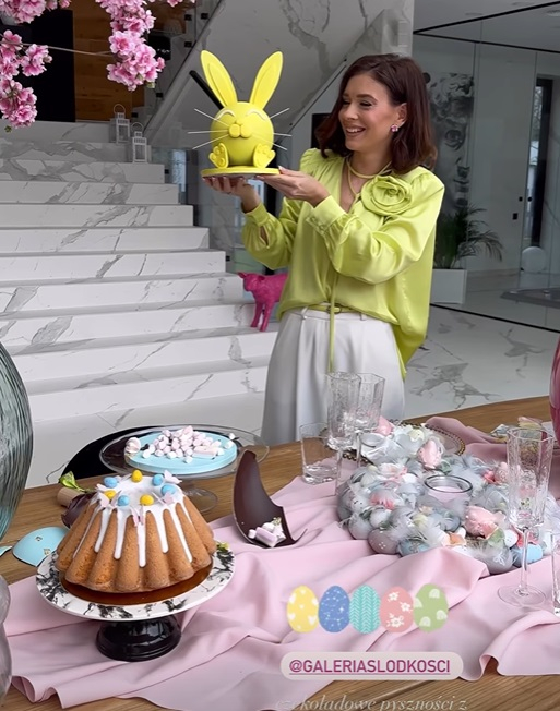 W tym roku Klaudia Halejcio postawiła na pastelowe barwy. Jasne, miłe dla oka kolory pojawiły się na wielu dodatkach. Ich delikatne, słoneczne odcienie nieco ociepliły marmurową willę w stylu glamour. Na monumentalnym stole z drewnianym blatem w części dziennej celebrytka ustawiła złote figury zająców, ogromne bukiety kwiatów i plastikowe jaja pokaźnych rozmiarów.