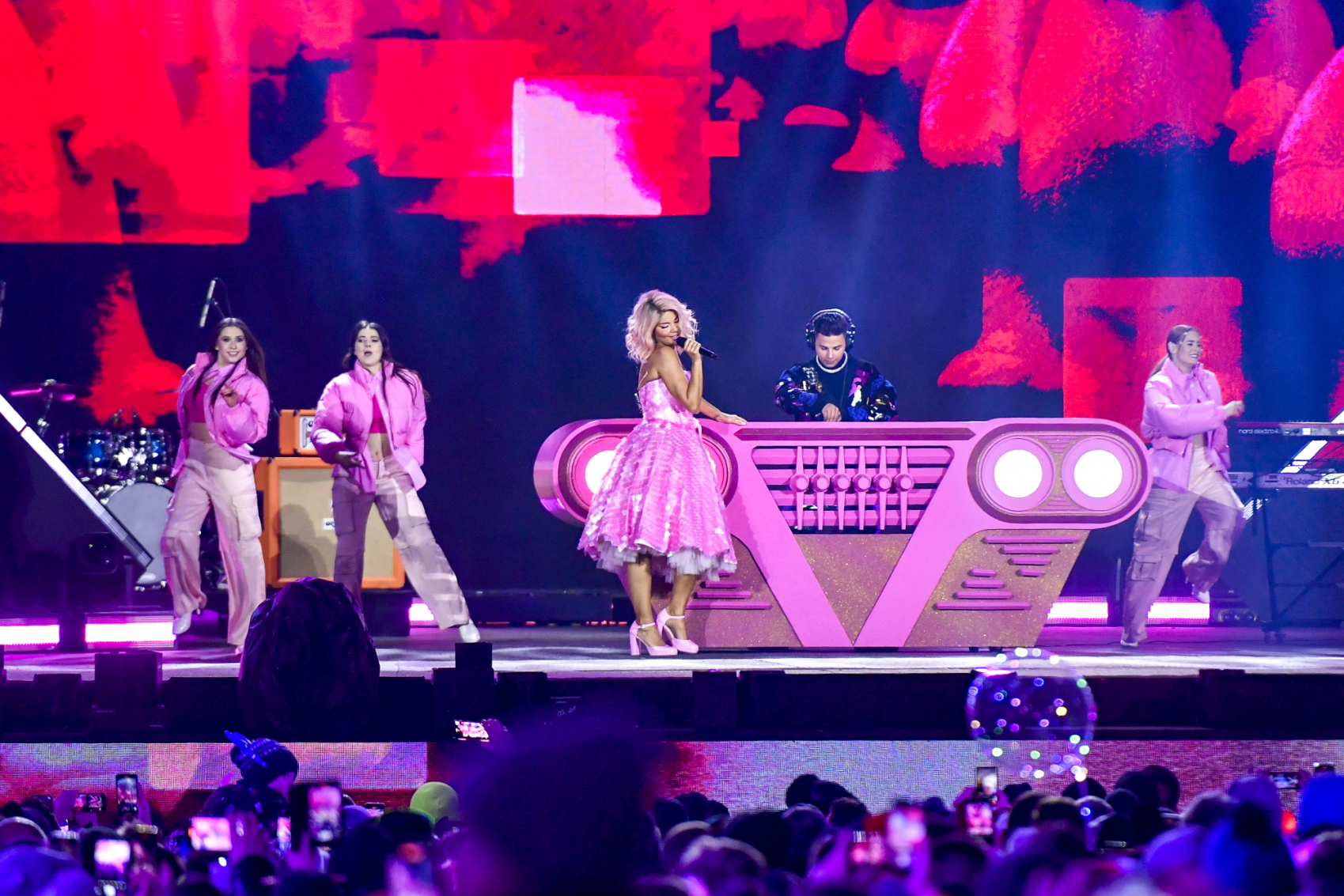 Edyta Górniak na „Sylwestrze z Dwójką” wystąpiła razem z synem, Allanem Krupą. Diwa zaskoczyła wszystkich swoją stylizacją. Przed publicznością pokazała się w cukierkowej różowej kreacji i… blond włosach z różowymi pasmami. Zaśpiewała między innymi utwór stworzony do filmu o Barbie, co zapewne zainspirowało ją do upodobnienia się słynnej lalki. Tancerki także miały na sobie różowe kurtki, a konsla DJ-a, za którą stał Allan, również była w tym samym kolorze.