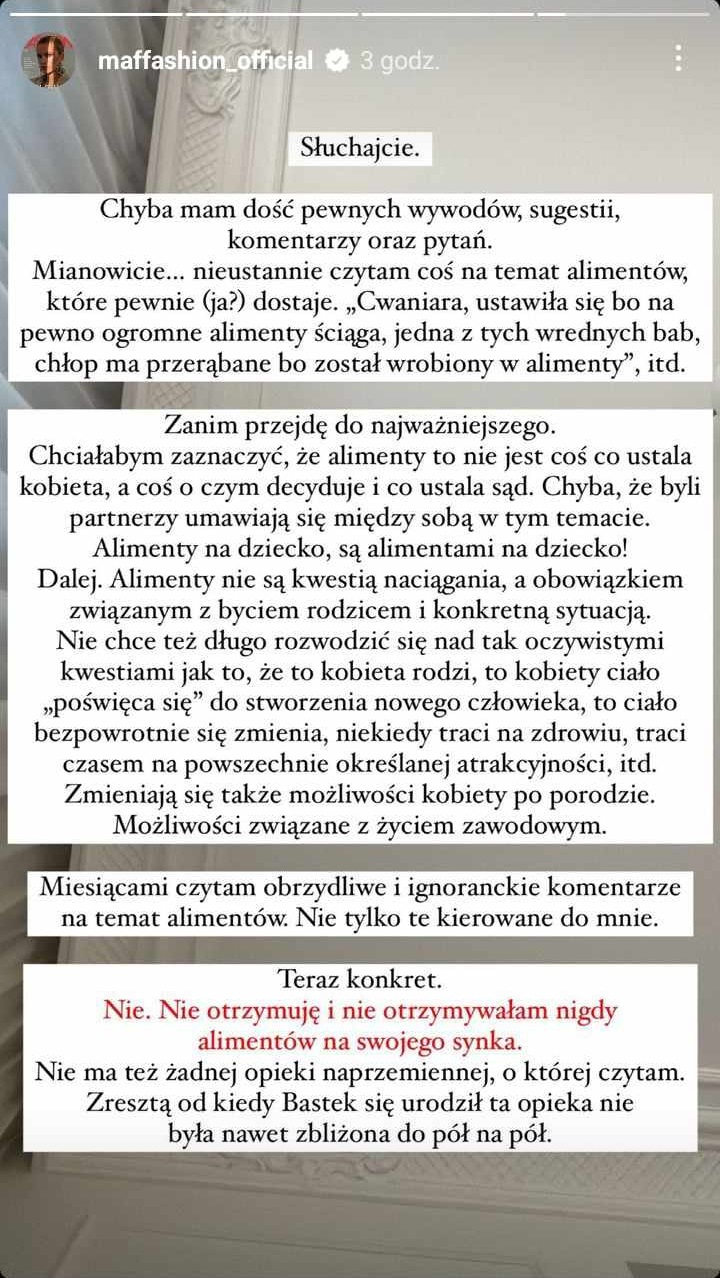 Julia Kuczyńska, influencerka znana jako Maffashion, przez kilka lat była w związku z Sebastianem Fabijańskim. Para doczekała się syna Bastiana, który przyszedł na świat 10 września 2020 roku. Rozstaniu instagramerki i aktora w 2022 roku towarzyszyły spore kontrowersje. Choć od tamtej pory minął już rok, emocje zdają się wcale nie stygnąć. Oboje wciąż otrzymują kolejne pytania dotyczące łączącej ich relacji. Maffashion w końcu powiedziała: „dość”. Zmęczona spekulacjami na temat alimentów, jakie ma otrzymywać od byłego partnera, zdecydowała się postawić sprawę jasno.