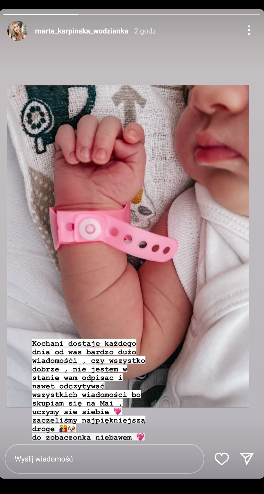 1 lipca 2022 roku Marta Karpińska zamieściła w InstaStories uroczy kadr z córeczką - Mają. Szczęśliwa mama przyznała, że dostaje od troskliwych fanów mnóstwo wiadomości. W tym wyjątkowym czasie przede wszystkim skupia na ukochanym dziecku, więc przerwa w internetowej aktywności jest w pełni zrozumiała. Zapowiedziała jednak, że niebawem wróci do regularnych kontaktów ze swoimi obserwatorami.