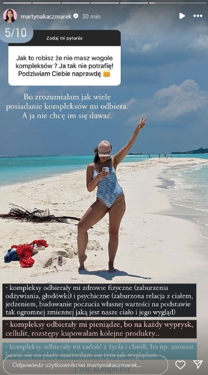 Kompleksy odbierały mi zdrowie fizyczne i psychiczne. Kompleksy odbierały mi pieniądze, bo na każdy wyprysk, cellulit, rozstępy kupowałam kolejne produkty. Kompleksy odbierały mi radość z życia i chwili, bo np. zamiast bawić się na plaży, martwiłam się, jak wyglądam – napisała Kaczmarek.fot. Stories/martynakaczmarek