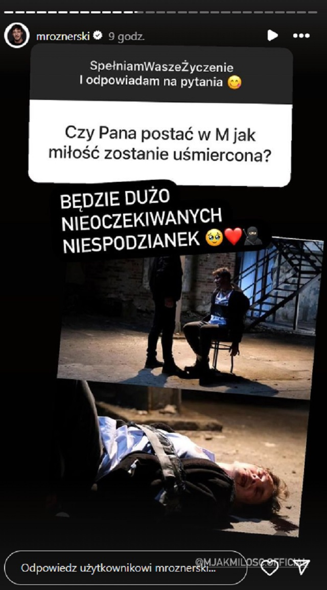 Zanim rozpocznie się wakacyjna przerwa w emisji, widzowie „M jak miłość” będą świadkami scen wprost mrożących krew w żyłach. Marcin będzie bowiem przetrzymywany przez Roberta. Związany Chodakowski nie będzie w stanie się bronić. Według informacji opublikowanych przez „Świat Seriali” w ostatniej scenie 1808. odcinka Marcin będzie nieprzytomny… Czy to oznacza, że były mąż Izy (Adriana Kalska) i obecny partner Kamy (Michalina Sosna) umrze? Właśnie takie pytanie zadali Mikołajowi Roznerskiemu czujni internauci, a on odpowiedział na nie na Instagramie.