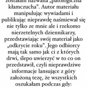 Niedawno pojawił się na mój temat obraźliwy materiał, w którym zostałam nazwana „patologiczną kłamczucha”. Autor materiału, manipulując wywiadami i publikując nieprawdę, naśmiewał się nie tylko ze mnie, ale i rzekomo nierzetelnych dziennikarzy, przedstawiając swój materiał jako „odkrycie roku". Jego odbiorcy mają tak samo jak ci, z których drwi, ślepo uwierzyć w to, co on przedstawił, czyli nieprawdziwe informacje lansujące z góry założoną tezę, że wszystkich oszukałam