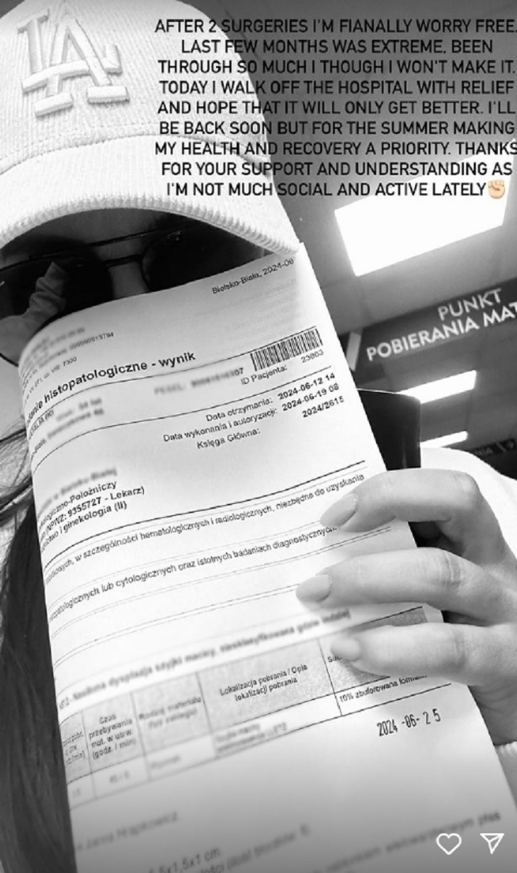 Natalia Janoszek ostatnio aktywna show-biznesowo była w maju – wtedy pojawiła się na czerwonym dywanie w Cannes. Później wycofała się, a czerwcowa publikacja kadru z placówki medycznej wiele wyjaśniła. 2 czerwca na jej Instagramie pojawił się kolejny materiał na relacji – celebrytka zrobiła sobie zdjęcie w szpitalu, trzymając w ręce wyniki badań. Wystosowała krótkie oświadczenie: