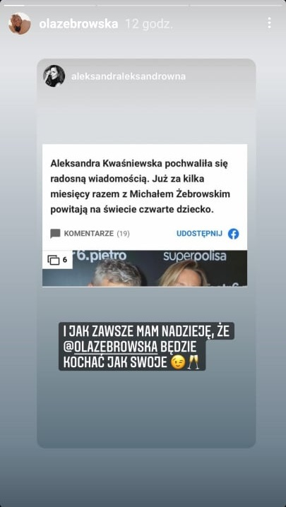Ola Kwaśniewska opublikowała na Instagramie screen artykułu o ciąży swojej imienniczki, w którym jednak omyłkowo zmieniono jej nazwisko. Przez to wspomniany fragment sugeruje, że to właśnie ona ma być w ciąży z Michałem Żebrowskim. Znana z ogromnego poczucia humoru 40-latka obróciła całą sytuację w żart. Oznaczając instagramowy profil żony aktora, napisała z przekąsem:
