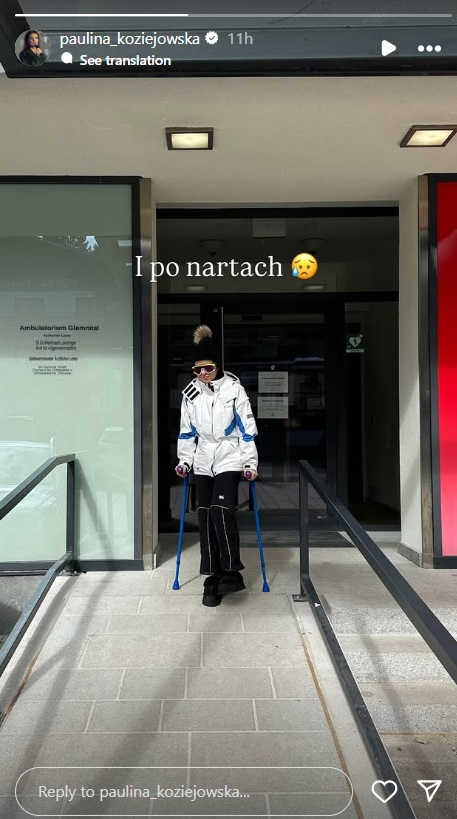 O wypadku na stoku Paulina Koziejowska poinformowała na Instagramie. Na jednej z relacji opublikowała zdjęcie wykonane przed budynkiem placówki medycznej. Prezenterka została uwieczniona w momencie, gdy poruszała się o kulach.