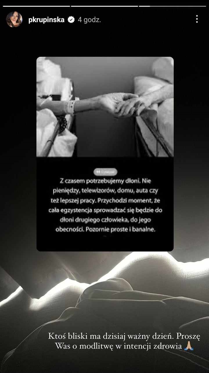 Zaledwie dzień po wielkiej fecie w „Dzień dobry TVN” Paulina Krupińska zamieściła na Instagramie relację, w której zwróciła się do fanów z pilnym apelem. Gwiazda poprosiła modlitwę w intencji zdrowia. Prezenterka nie wyjaśniła, co dokładnie się dzieje, ale zdradziła, że chodzi o bliską jej osobę.