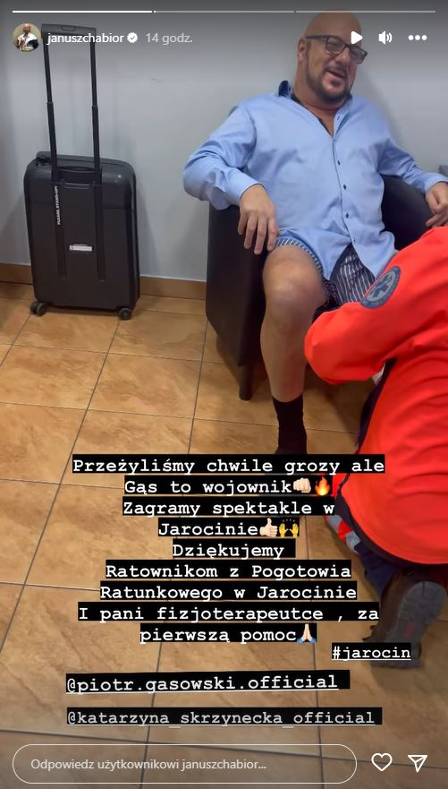 Choć całe zdarzenie wyglądało groźnie, to nie uniemożliwiło aktorowi występu w spektaklu. Po zbadaniu i opatrzeniu przez medyków Piotr Gąsowski pojawił się na scenie w Jarocinie. Gdy widowisko dobiegło końca, Janusz Chabior opublikował na Instagramie zdjęcie, na którym trio pozuje z ratownikami medycznymi. Nie zabrakło podziękowań dla pracowników służby zdrowia za udzieloną pomoc.