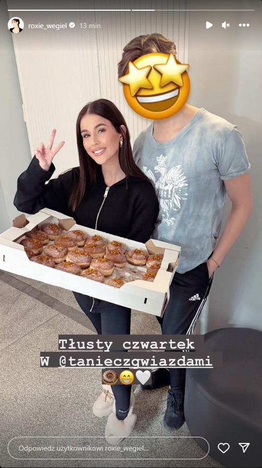 Dziś Roxie opublikowała w sieci kolejną porcję zdjęć z treningu. Pokazała także, że co dzisiaj dzieje się w przerwie między zmaganiami na parkiecie. Uczestnicy „Tańca z gwiazdami” postanowili świętować tłusty czwartek. Roksana częstowała ich pączkami. Opublikowała także zdjęcie, na którym zapozowała z tajemniczym mężczyzną. Oboje patrzyli prosto w obiektyw, a jego twarz została zasłoniona emotikoną. Jest to zatem prawdopodobnie jej partner, z którym powalczy o Kryształową Kulę.