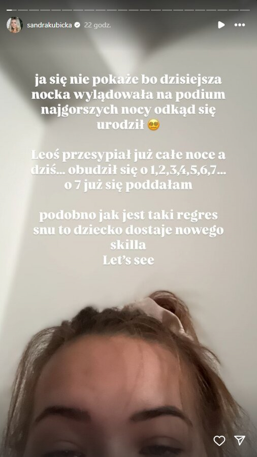 Z dalszej części wpisu mogliśmy się dowiedzieć, co spotkało młodą mamę. Jak się okazuje, Leoś budził się co godzinę, a 7 rano zmęczona brakiem snu Sandra „już się poddała”. Modelka stwierdziła, że ta sytuacja to regres snu, który często pojawia się u małych dzieci.