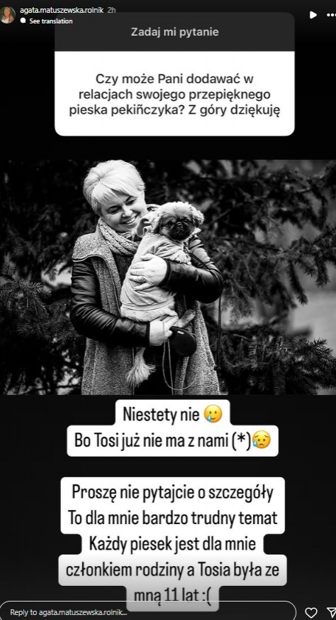 W odcinkach programu TVP widzowie często zwracali uwagę na otoczenie wokół gospodarstwa Agaty. Kamery uchwyciły m.in. będącego w kojcu psa. Widok ten był szeroko komentowany; w stronę Agaty napłynęła krytyka. Niektórzy porównywali sytuację czworonoga z innym pieskiem, który również był widoczny w epizodach. Teraz głos zabrała sama zainteresowana. Matuszewska zamieściła na Instagramie słowo wyjaśnienia. Podzieliła się również przykrą historią.