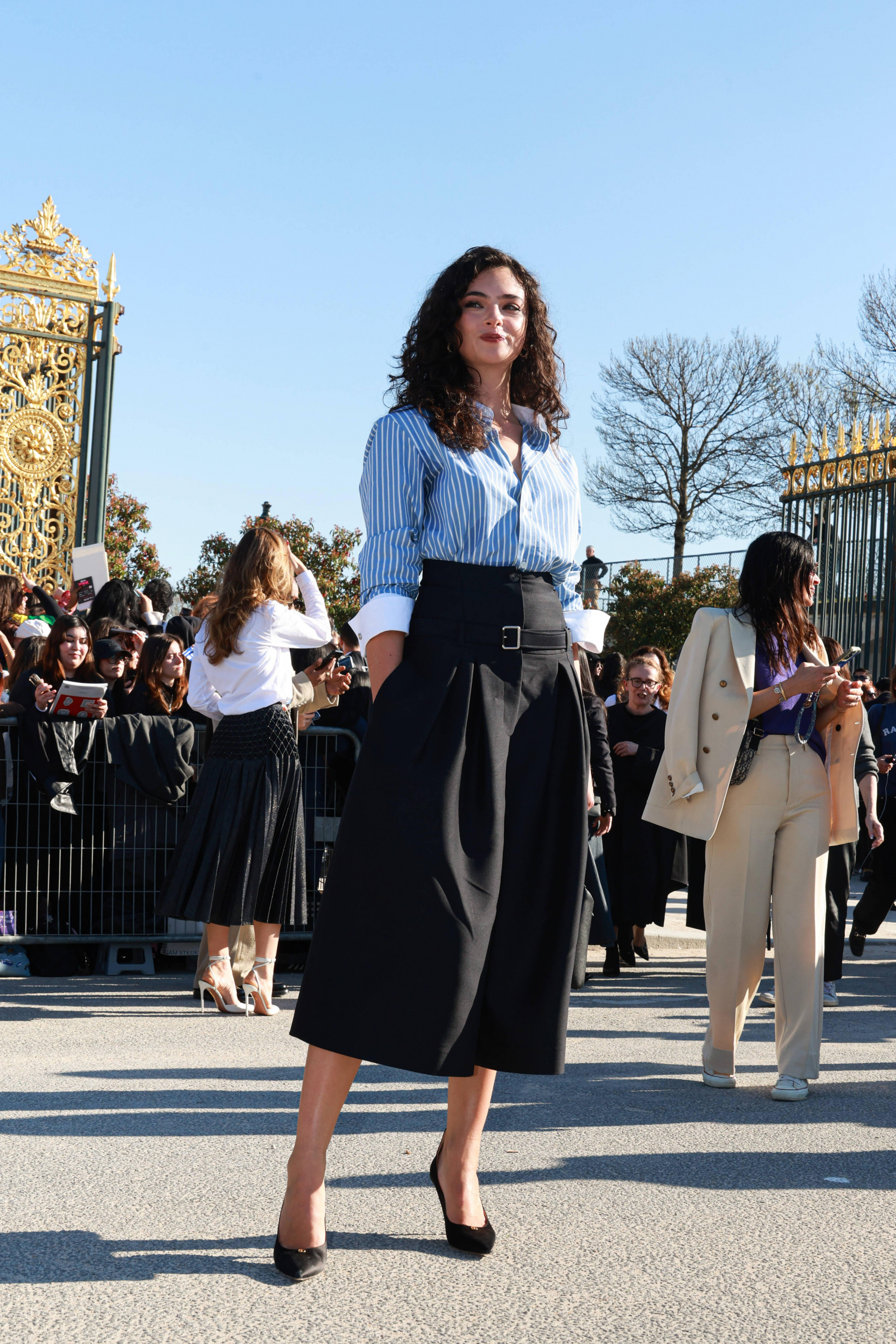 Deva Cassel postawiła na klasyczną, paryską elegancję. Wybrała błękitną koszulę w paski, którą zestawiła z ciemną, rozkloszowaną spódnicą midi z wysokim stanem, czarnymi szpilki oraz minimalistyczną torebką, a całość dopełniły subtelne dodatki i nonszalancko podwinięte rękawy koszuli. To połączenie ponadczasowej klasyki z nowoczesnym minimalizmem pokazało, że 21-latka doskonale odnajduje się w aktualnych trendach.