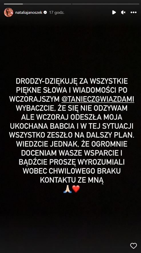 Drodzy – dziękuję za wszystkie piękne słowa i wiadomości po wczorajszym (poniedziałkowym - przyp. red.) "Tańcu z Gwiazdami". Wybaczcie, że się nie odzywam, ale wczoraj (w poniedziałek - przyp. red.) odeszła moja ukochana babcia i w tej sytuacji wszystko zeszło na dalszy plan. Wiedzcie jednak, że ogromnie doceniam wasze wsparcie i bądźcie proszę wyrozumiali wobec chwilowego braku kontaktu ze mną