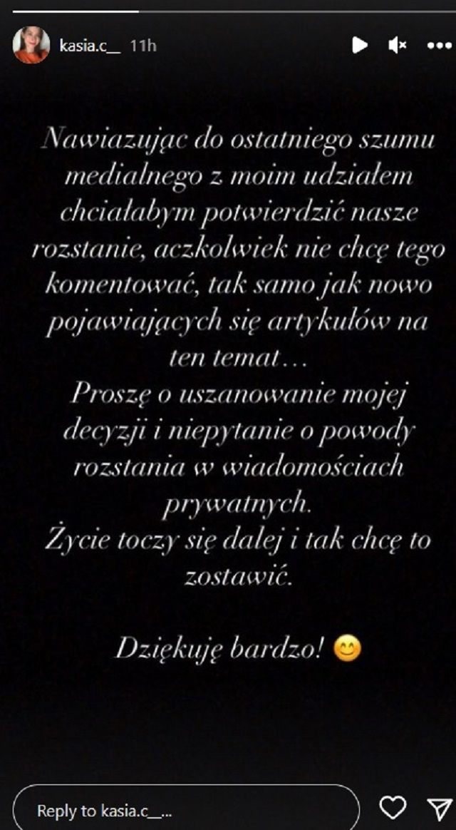Nawiązując do ostatniego szumu medialnego z moim udziałem, chciałabym potwierdzić nasze rozstanie, aczkolwiek nie chcę tego komentować, tak samo, jak nowo pojawiających się artykułów na ten temat… Proszę o uszanowanie mojej decyzji i niepytanie o powody rozstania w wiadomościach prywatnych. Życie toczy się dalej i tak chcę to zostawić. Dziękuję bardzo!