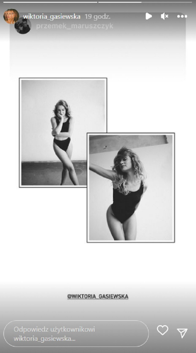 W ostatnim czasie Wiktoria udostępniła na relacji post, jaki pojawił się na profilu fotografa Przemysława Maruszczyka. Autor zdjęć pokazał ujęcia właśnie z aktorką w roli główniej. Czarno-białe zdjęcia przedstawiają modelkę odzianą w ciemne body oraz w dwuczęściowy strój.