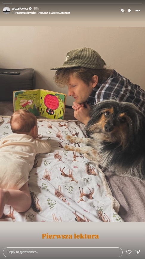 Jakub Józefowicz został uchwycony w momencie, gdy czyta książeczkę swojej córeczce. Towarzyszy im pies Mikson, a całość opatrzona została krótkim, ale wymownym podpisem: „Pierwsza lektura”.
