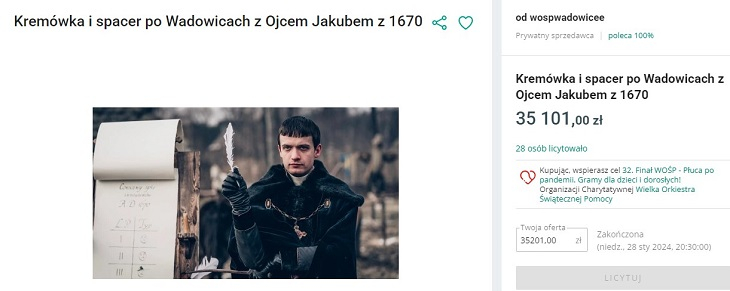 W minioną niedzielę aukcja Michała Sikorskiego została zakończona. Zwycięzca licytacji za atrakcję przygotowaną przez wadowiczanina zapłacił 35 101 zł.